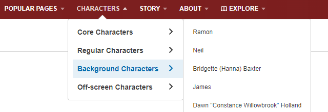 With regard to the drop-down / pull-out menus, note that the pull-out section will only ever show the 8 most popular entries. For example, once more than 8 'Background Character' entries are created, you will only see 8 entries under 'Characters > Background Characters > ...' section of the menu.
